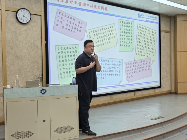 9月20日,资环学院2025届毕业生就业指导动员会在徐汇校区七中举行,校学生就业指导服务中心副主任盖钧超应邀出席并作培训讲座,学院党委副书记曹娜、本研毕业班辅导员以及全体本研应届毕业生参会。