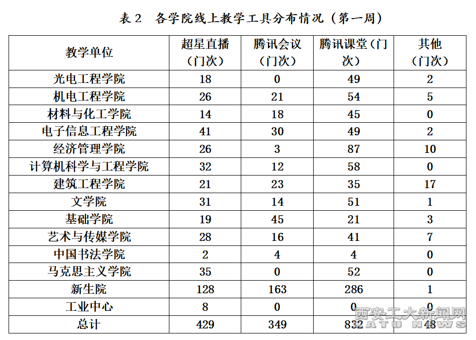教师在线上教学过程中能够根据自己课程特点,合理使用在线教学平台与直播工具。在线教学工具中使用腾讯课堂832门次、占比50.18%;超星直播429门次,占比25.87%;腾讯会议349门次、占比21.05%;其他48门次,占比2.90%。