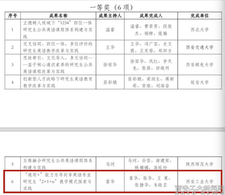 (本网讯)近日,陕西省学位与研究生教育学会公布了《2023年陕西省学位与研究生教育学会外语教学工作委员会研究生外语教学成果奖评选》获奖名单,beat365文学院老师雷华及其团队申报的《“通用+”能力为导向非英语专业研究生“2+1+n”教学模式探索与实践》荣获一等奖。