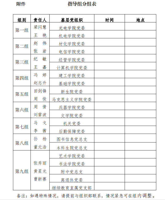 指导组主要职责:对各基层党委(党总支、直属党支部)代表选举工作和基层党组织换届工作进行指导。指导组分组情况见附件。
